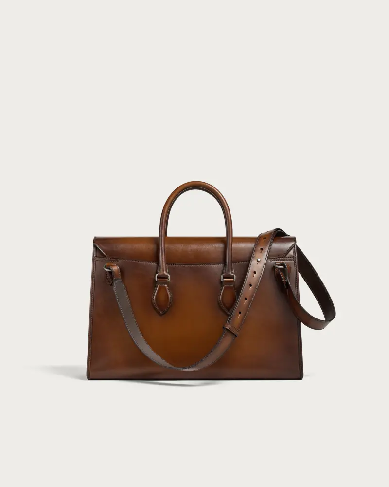 Created in 2010 by Olga Berluti, E’Mio was the first soft satchel in the Maison’s leather goods collections. E’Mio reinterprets the classic briefcase with a whimsical trapezoidal shape and an elegant fastening system, while its strap means it can be worn over the shoulder for cyclists.